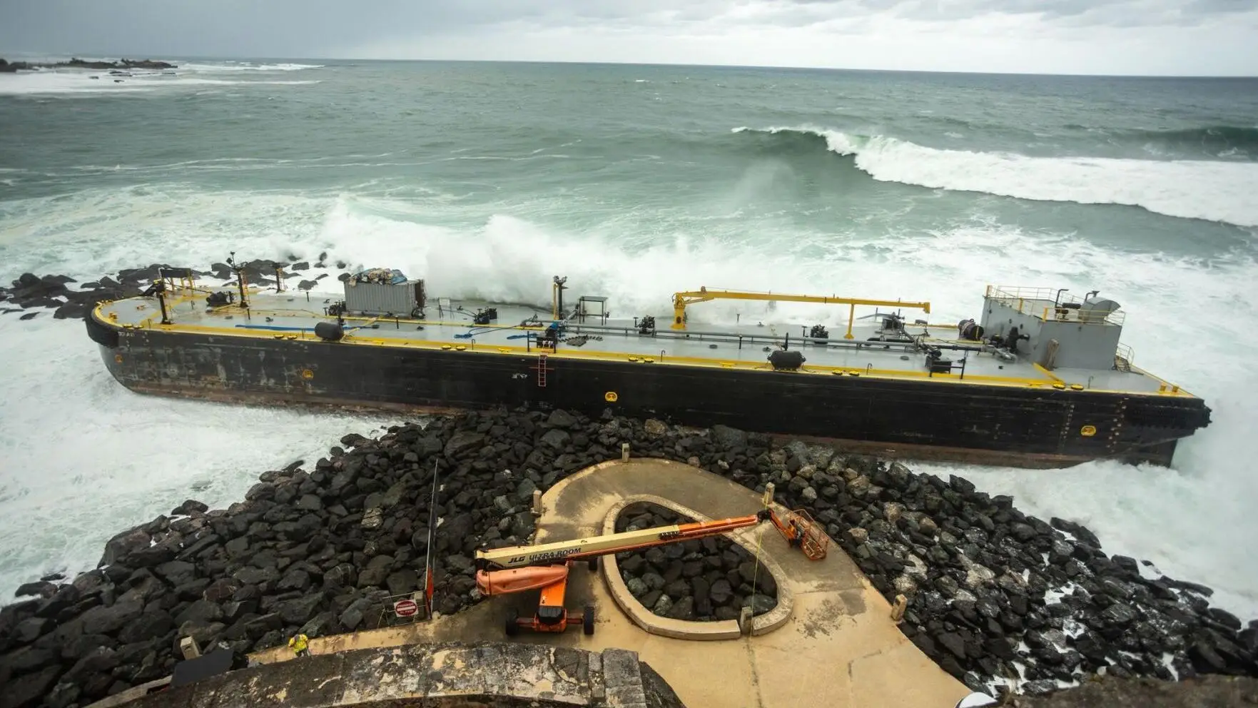 Surprisingly, the harbour remains open. Because the barge was grounded on the headland and is stuck in the manmade rock installations, it is not currently obstructing the main navigation channel. Shipping companies operating in the region have been advised to exercise caution but can continue scheduled arrivals and departures.